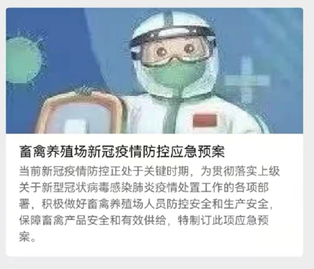 一是制定《畜禽养殖场新冠疫情防控应急预案》,通过自媒体微信群、《微信公众号》等形式分发至各养殖场户手中,开展“无接触”培训,提高养殖场户及相关从业人员生物安全管理意识,提高防范生物安全风险的能力。