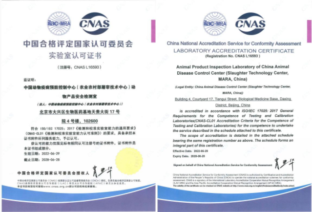 该认可是继中国动物疫病预防控制中心动物产品安全检测室获得CMA和CATL认证之后,又一次对实验室质量管理体系的全面检验,提升了检验检测的科学化、规范化和标准化水平,并表明达到了实验室间国际互认要求。通过CNAS认可,中心将为农业农村部提供更全面的技术支撑,为屠宰行业高质量发展提供更有力的技术服务,为参与处理国际事务提供更坚实的技术保障。