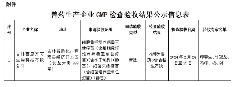 根据《兽药生产质量 管理规范(2020年修订)》、农业农村部第292号公告,依照《兽药生产质量管理规范检查验收办法》等相关规定,吉林省畜牧业管理局组织检查组对吉林百思万可生物科技有限公司实施兽药GMP情况进行了现场检查验收。现将检查验收结果在吉林省畜牧业管理局官网上予以公示,公示时间为2024年2月27日至3月4日,如对检查验收结果有异议,请将意见和建议反馈给吉林省畜牧业管理局兽医药政处。