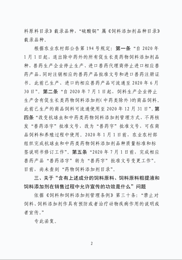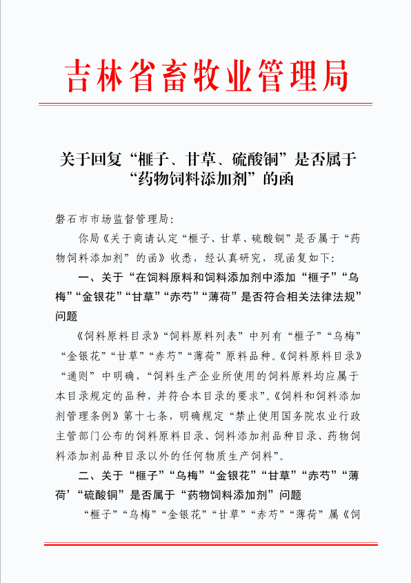 关于回复“榧子、甘草、硫酸铜”是否属于“药物饲料添加剂”的函