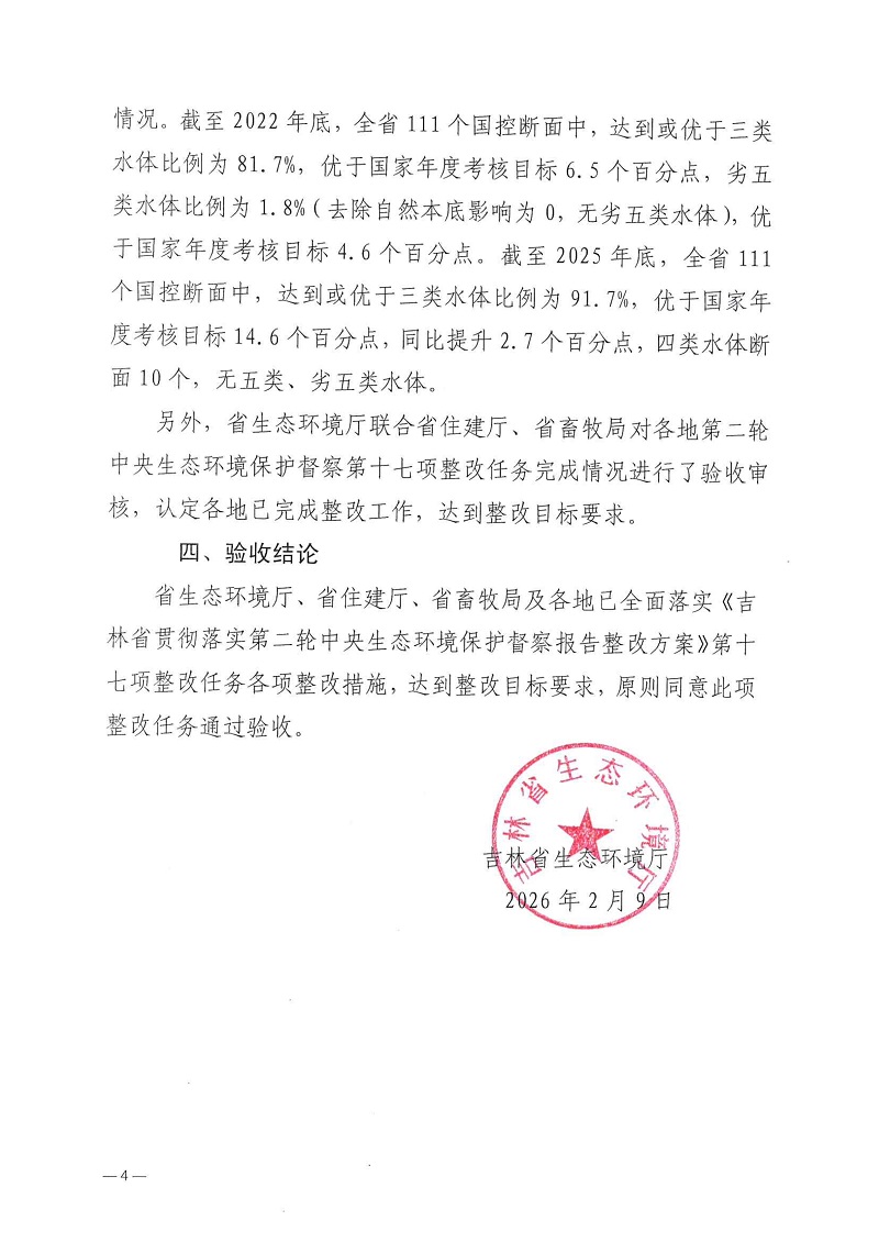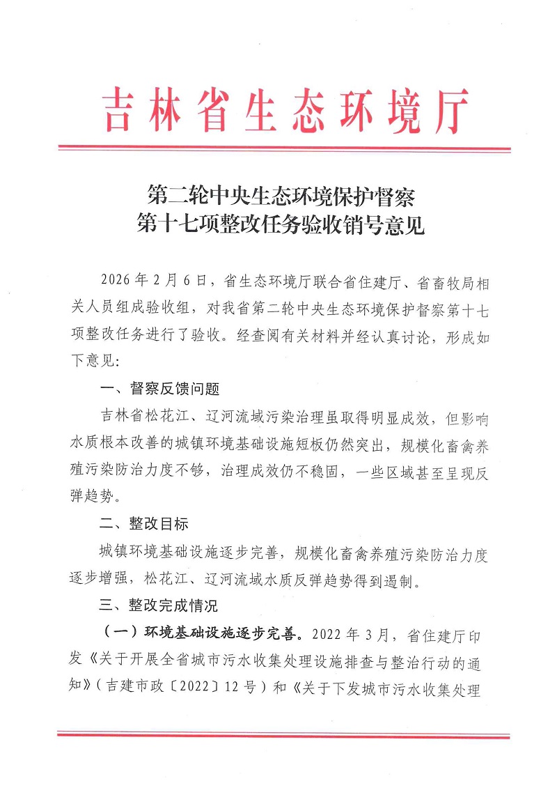 2026年2月6日,省生态环境厅联合省住房城乡建设厅、省畜牧局相关人员组成验收组,对我省第二轮中央生态环境保护督察第十七项整改任务进行了验收。经查阅有关材料并经认真讨论,原则同意此项整改任务通过验收。现将《第二轮中央生态环境保护督察第十七项整改任务验收销号意见》进行公示,请社会各界监督。如有异议,请在公示期内向我局反映,反映问题要实事求是,并提供反映人员姓名、联系方式等信息,便于后续反馈。