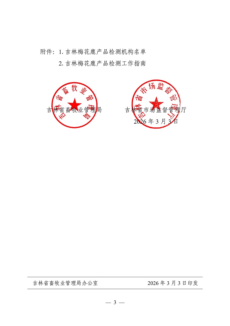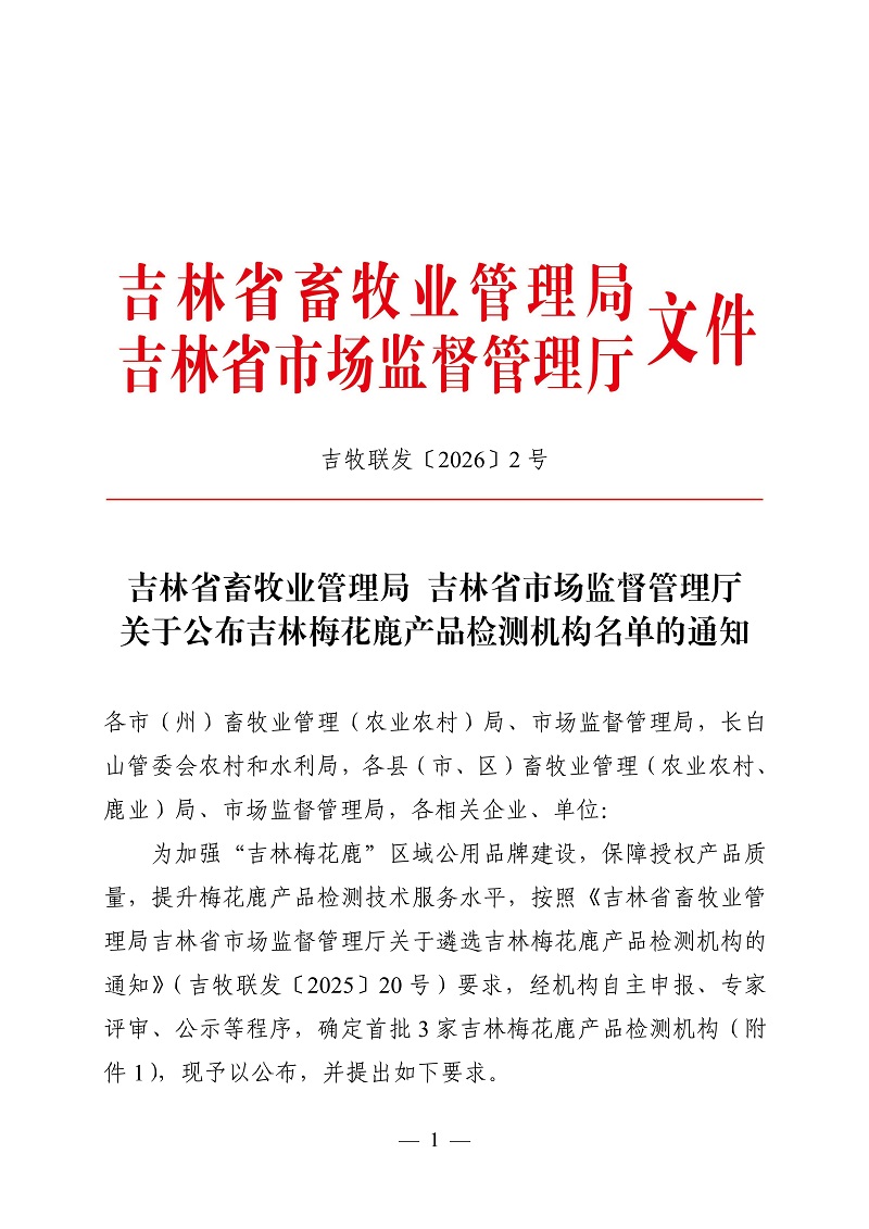 吉林省畜牧业管理局 吉林省市场监督管理厅关于公布吉林梅花鹿产品检测机构名单的通知
