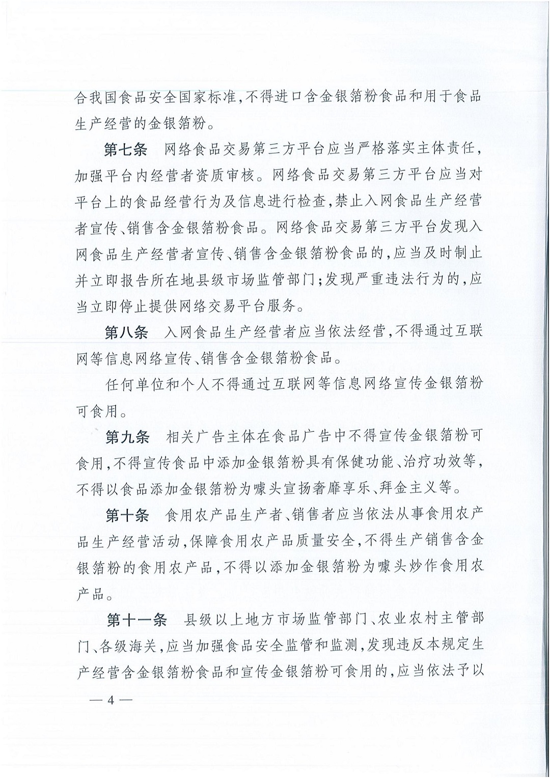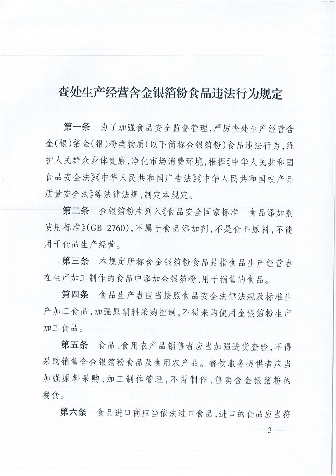 根据《中华人民共和国食品安全法》《中华人民共和国广告法》《中华人民共和国农产品质量安全法》等法律法规,市场监管总局、农业农村部、国家卫生健康委、海关总署联合制定了《查处生产经营含金银箔粉食品违法行为规定》。现予以公告,自发布之日起施行。