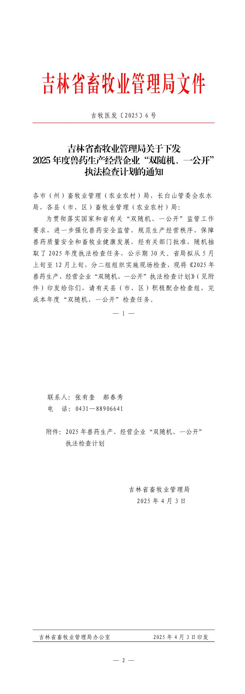 吉林省畜牧业管理局关于+下发2025年度兽药生产经营企业+“双随机、一公开”执法检查计划的通知