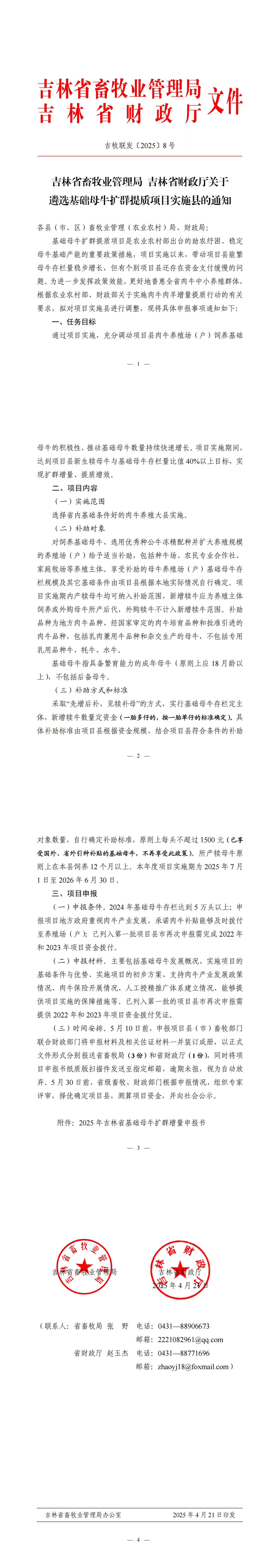 吉林省畜牧业管理局 吉林省财政厅关于遴选基础母牛扩群提质项目实施县的通知