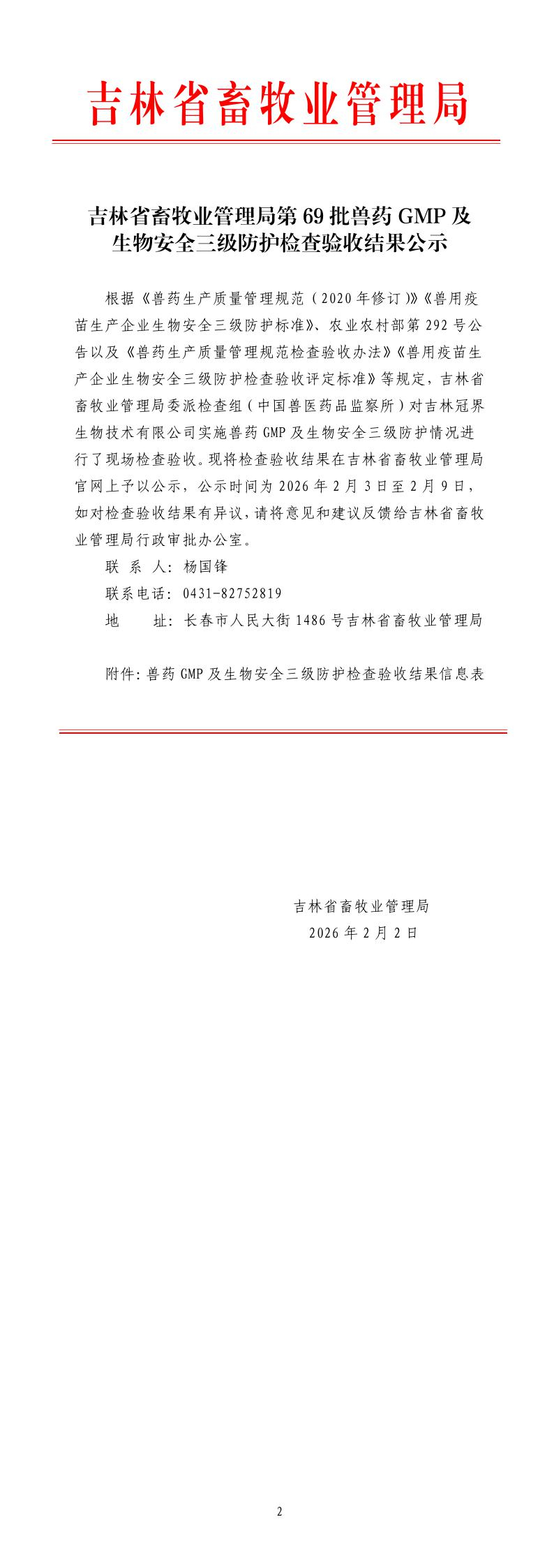 吉林省畜牧业管理局第69批兽药GMP及生物安全三级防护检查验收结果公示